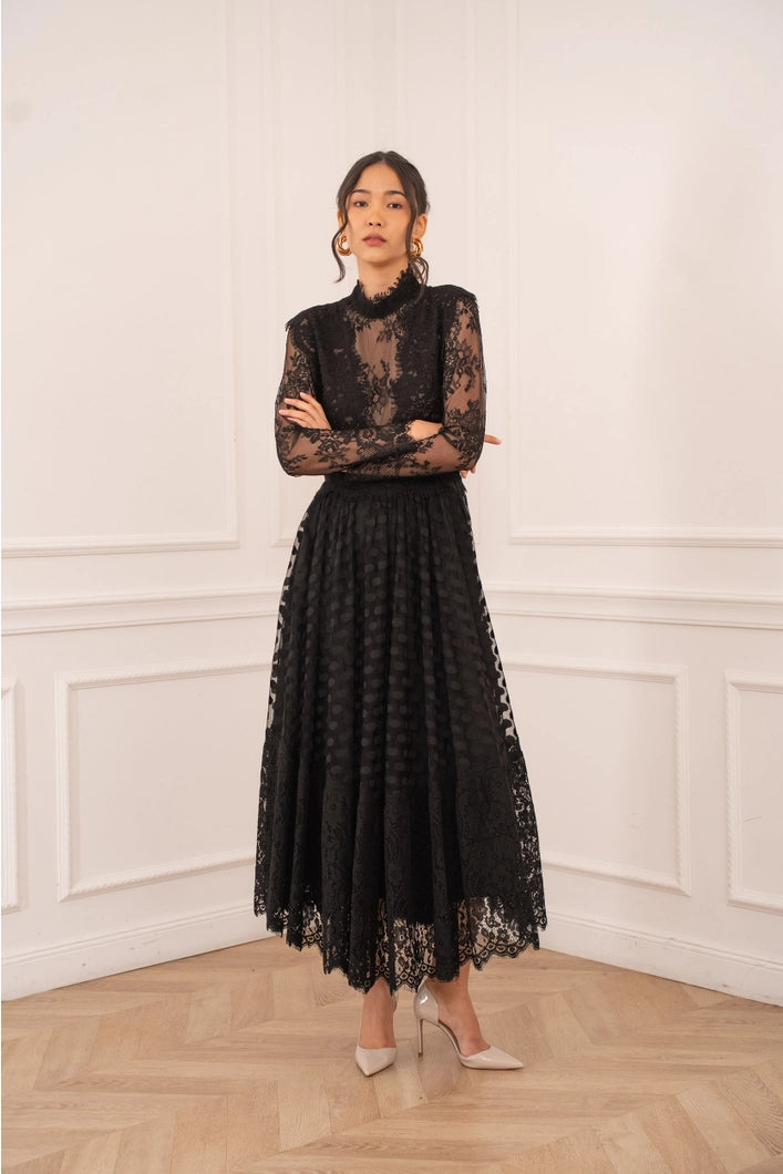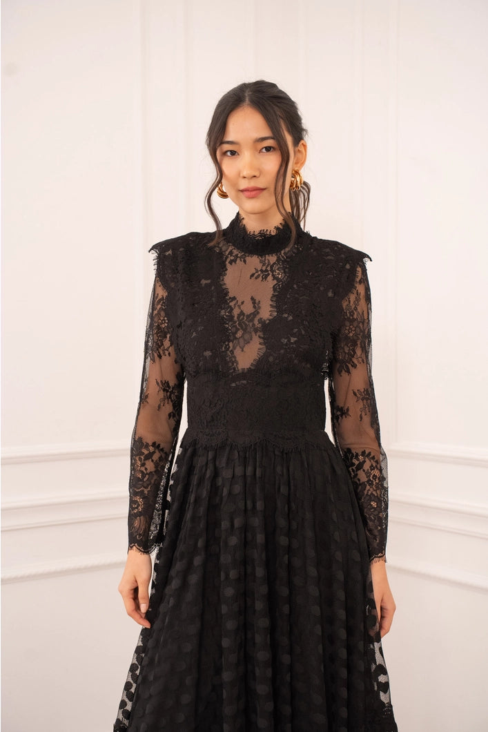 This sophisticated black lace midi dress combines delicate craftsmanship with modern sensibility. Featuring a tulle skirt adorned with polished polka dots, the piece offers an elegant silhouette that flatters and flows with ease. Perfect for evening events, celebrations, or refined occasions, Trinny transitions seamlessly from formal settings to elevated everyday styling. Layer with a structured blazer, faux fur jacket, or keep it minimal with jewellery and heels—its timeless design ensures it remains a cornerstone piece in any discerning wardrobe. An enduring investment in understated luxury.